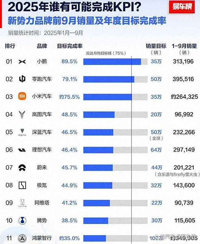 根据行业惯例,以75%的完成率作为前三季度的及格线,目前仅有小鹏、零跑和小米三家车企达标,而理想、蔚来等头部品牌的完成率均未过半,鸿蒙智行更是仅完成年度目标的35%,接下来我们一一来看。