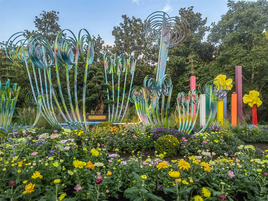 新民晚报记者获悉,菊花展期间,园内将布置菊花花坛、菊花自然花境等景观,打造“魔法森林”。比如,西门、南门入口将以塔菊、盆景菊、树菊、球菊等造型菊为骨架,融入飘带、竹艺等元素,营造浓厚的花展氛围。西门主干道树坛及两侧则将以“精灵森林”为主题,融入菊花及松鼠、奇幻蘑菇、精灵贝壳等元素。公园优美的水系岸边,则将以“魔法河流”为主题,以自然河道为基础打造彩叶覆膜材质花艺船造景,并融合悬浮花桶点缀,形成灵动浪漫的水上景观。
