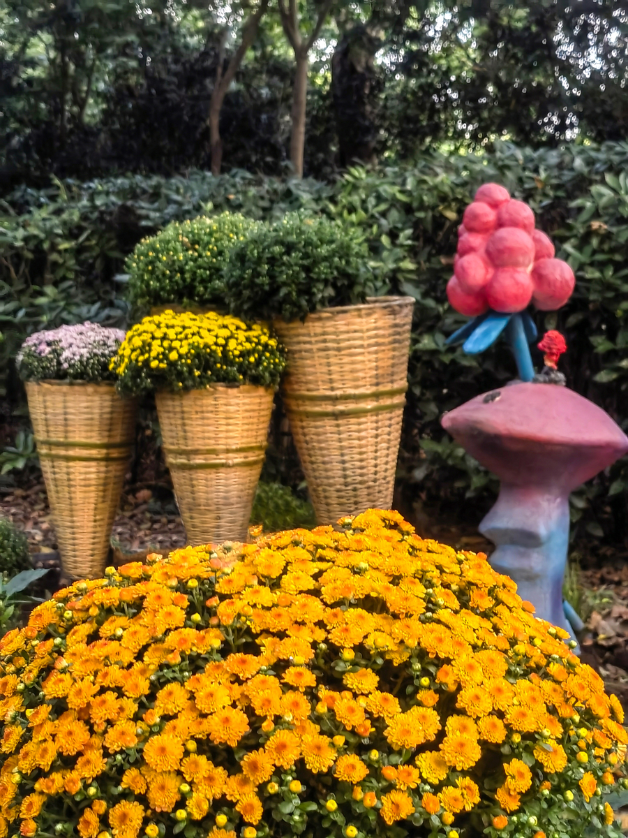 此次菊花展设室外景点、精品菊花以及插花油画艺术三大展示区域。室外景点共7组,在森林的背景下,以菊花为主要造型材料,采用竹构、藤编等生态工艺,打造形态多样、意蕴丰富的菊花景观。
